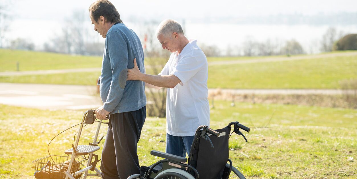 Ab diesem Moment konnte ich weder gehen noch stehen. Zwei Therapeuten haben zusammen versucht, mich auf die Beine zu bringen, ohne Erfolg. Die Diagnose: Bandscheibenvorfall zwischen Halswirbelsäule sechs und sieben. Die Bandscheibe war komplett raus, Nerven abgequetscht, daher dieser Totalausfall. Ich konnte weder Arme noch Beine bewegen. Nach der Not-OP hatte ich ein paar Tage Reha aber ich habe schnell versucht, einen Platz hier in den Kliniken Schmieder Allensbach zu bekommen, was gut funktioniert hat. Da war ich froh, denn durch meinen Job als Rehaberater in einem Sanitätshaus wusste ich von dem guten Ruf der Klinik. Liegend kam ich dann hier an.