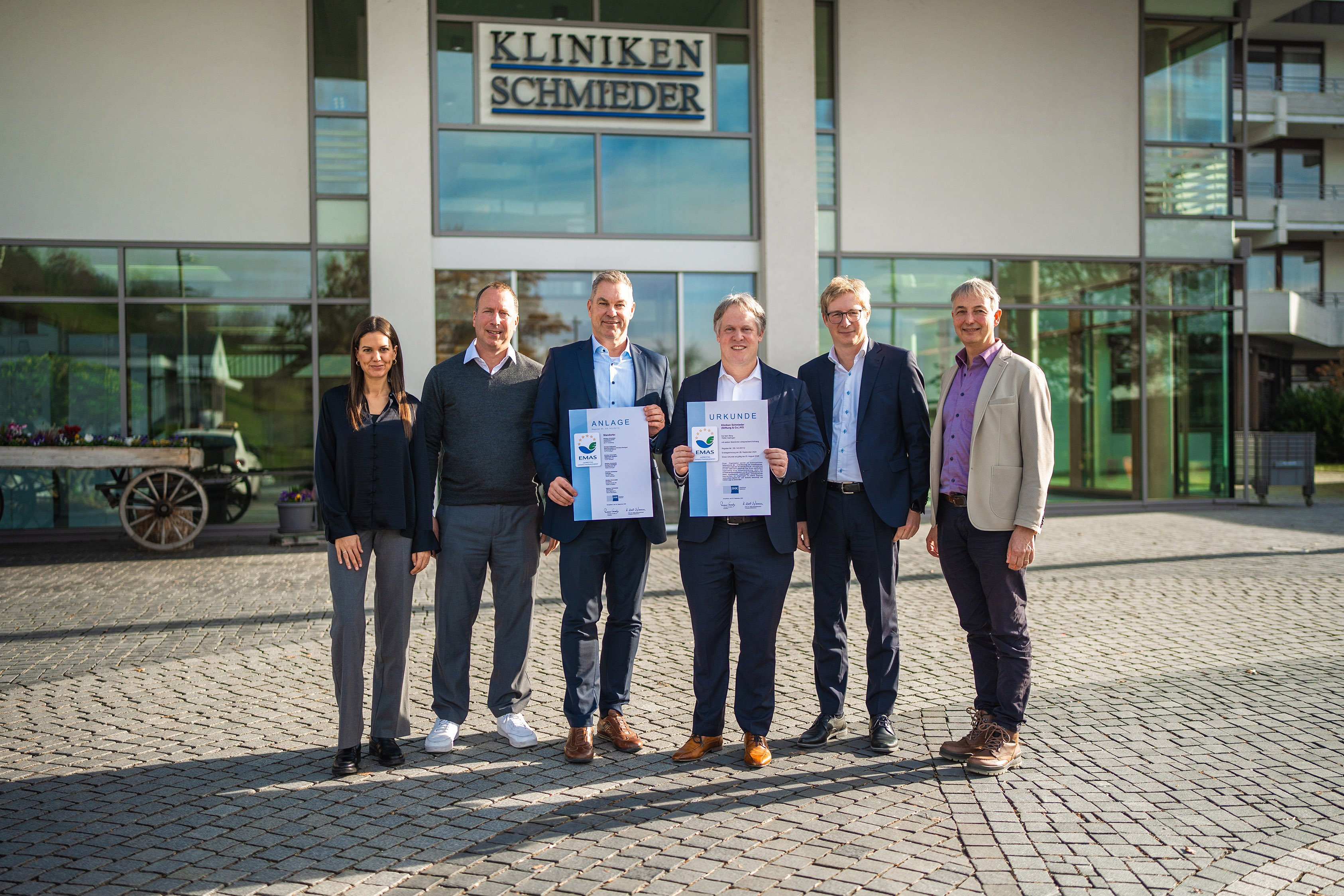 EMAS (Eco-Management and Audit Scheme) ist das weltweit anspruchsvollste System für nachhaltiges Umweltmanagement. Es verpflichtet Unternehmen dazu, ihre Umweltleistungen kontinuierlich zu verbessern, Ressourcen effizienter zu nutzen, sämtliche Umweltvorschriften konsequent einzuhalten und die Ergebnisse transparent in einer jährlichen Umwelterklärung zu veröffentlichen. Die Einhaltung dieser Standards wird regelmäßig durch einen unabhängigen Umweltgutachter überprüft. Nach der erstmaligen Teilnahme am EMAS-System sind alle Standorte der Kliniken Schmieder zertifiziert. Jährliche Audits stellen sicher, dass Umweltziele konsequent verfolgt und Fortschritte transparent dokumentiert werden. Die Re-Zertifizierung aller Standorte ist für das Jahr 2028 geplant.